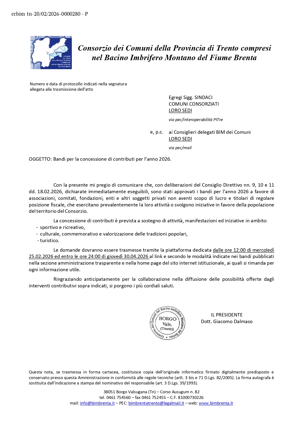 La concessione di contributi è prevista a sostegno di attività, manifestazioni ed iniziative in ambito: - sportivo e ricreativo, - culturale, commemorativo e valorizzazione delle tradizioni popolari, - turistico. Le domande dovranno essere trasmesse tramite la piattaforma dedicata dalle ore 12:00 di mercoledì 25.02.2026 ed entro le ore 24:00 di giovedì 30.04.2026 al link e secondo le modalità indicate nei bandi pubblicati nella sezione amministrazione trasparente e nella home page del sito internet istituzionale, ai quali si rimanda per ogni informazione utile.