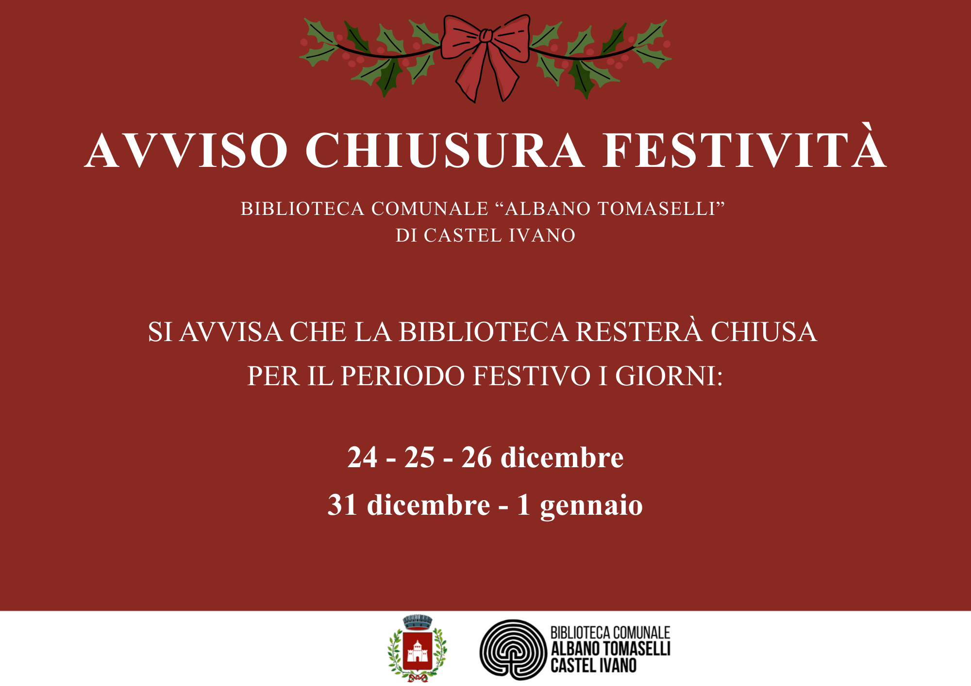 Descrizione Si comunica che la biblioteca rimarrà chiusa per le festività mercoledì 24 e mercoledì 31 dicembre 2025.Sabato 27 e martedì 30 dicembre la biblioteca è aperta nei consueti orari.