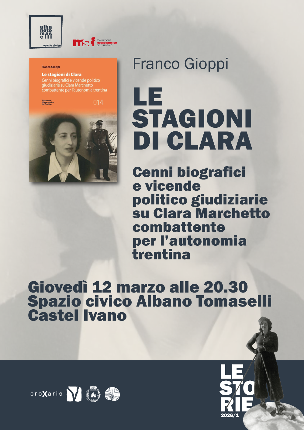 Franco Gioppi presenta il suo libro "Le stagioni di Clara", edito dalla Fondazione Museo storico del Trentino. Cenni biografici e vicende politico giudiziarie di Clara Marchetto, combattente per l'autonomia trentina.